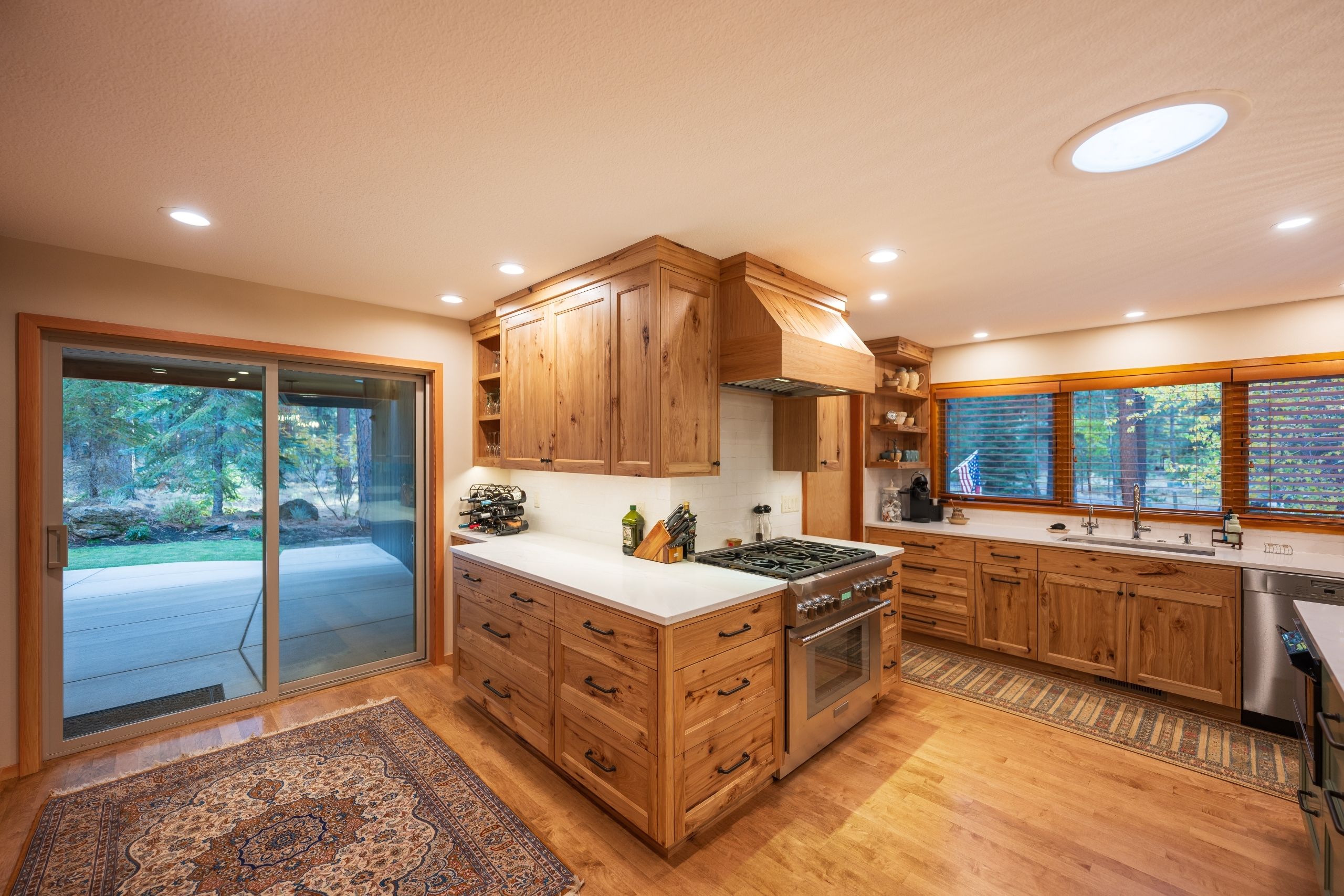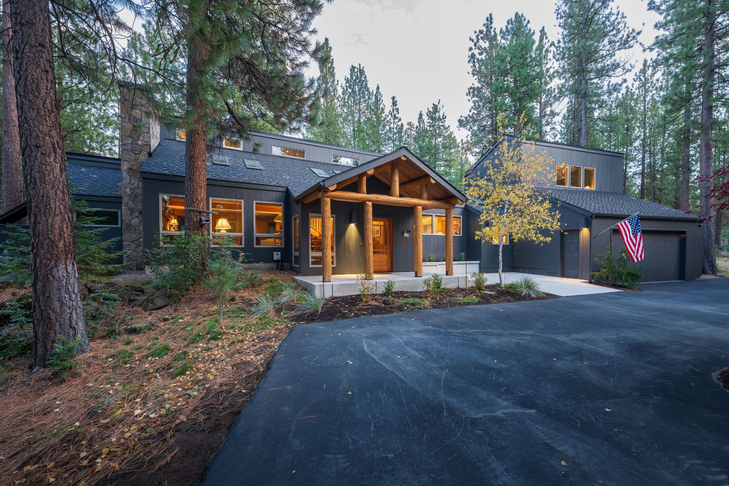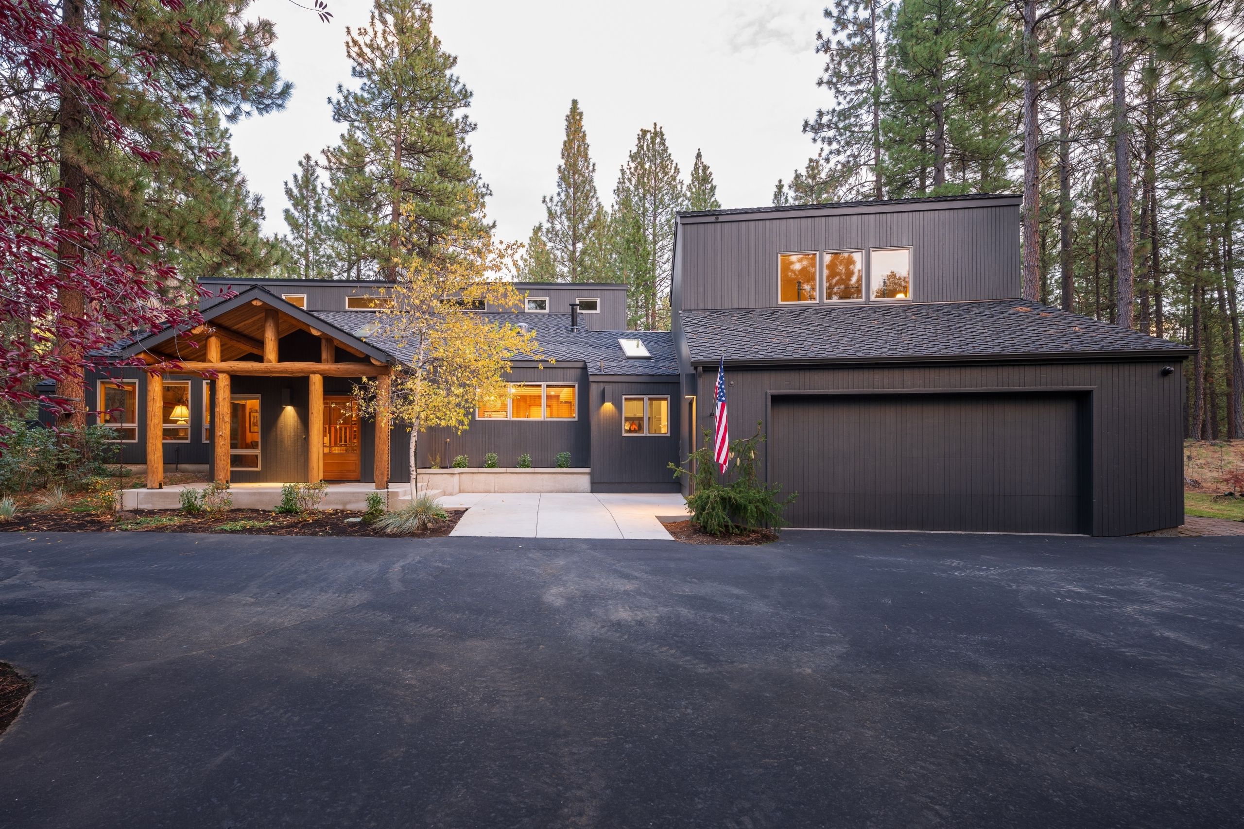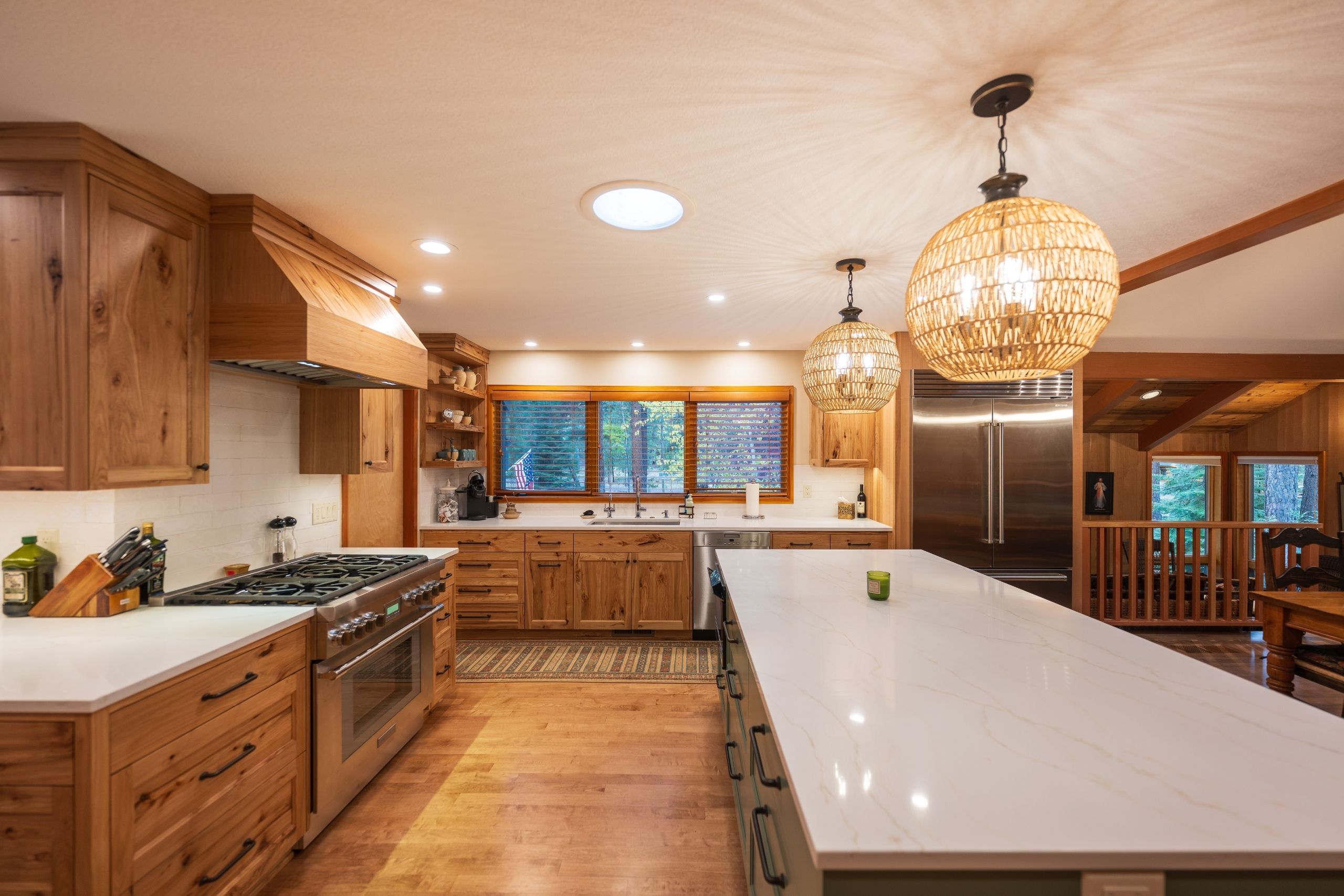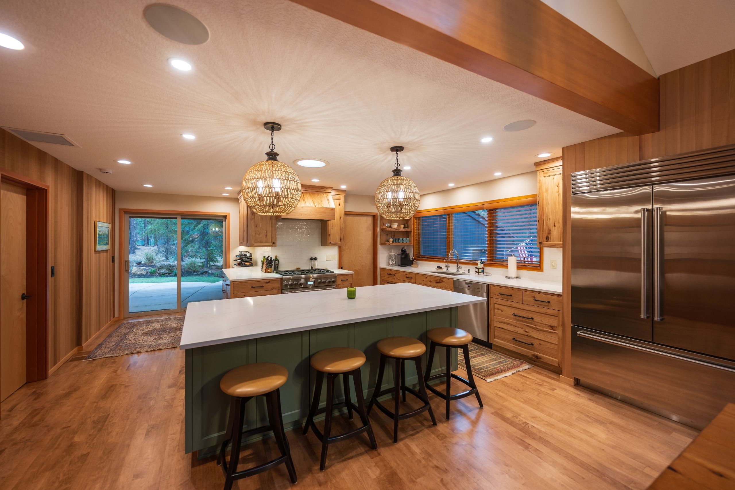 The Ponderosa Pine remodel in Sisters, Oregon is a stunning blend of rustic warmth and modern sophistication. Surrounded by towering pines, the home’s exterior features a bold, dark façade accented by natural wood posts and a welcoming covered entry. Inside, rich wood tones flow throughout the open-concept kitchen and dining area, complemented by vaulted ceilings and abundant natural light. Custom cabinetry, a spacious island with quartz countertops, and woven pendant lighting create a kitchen that is both functional and inviting. The remodel also includes a cozy built-in under the staircase, an expansive outdoor living space with a built-in grill, and a circular fire pit area perfect for gathering under the high desert sky. Every detail reflects craftsmanship and a deep connection to the natural beauty of Central Oregon.